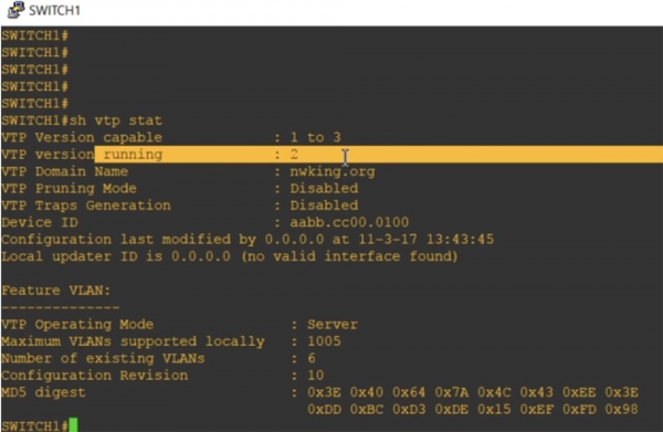 Посмотрим на состояние VTP с помощью команды show vtp status. Вы видите, что свитч работает в режиме VTP v2, при этом возможна поддержка версий 1 и 3. Я присвоил ему доменное имя nwking.org.