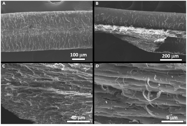 На снимке 1С отчетливо видна хрупкая поверхность кутикулы с визуализацией слоев, которые являются перекрывающими друг друга пластинками кутикулы и имеют толщину 350–400 нм. Наблюдаемое расслоение на поверхности разрушения, а также хрупкая природа этой поверхности показывают слабую межфазную связь между кутикулой и кортексом, а также между волокнами внутри кортекса.