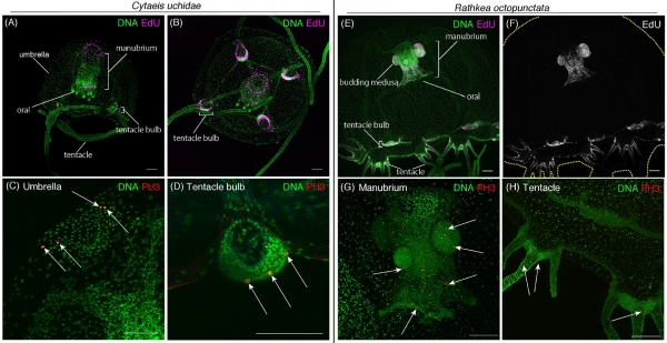 Π£ Cytaeis medusa EdU-ΠΏΠΎΠ»ΠΎΠΆΠΈΡΠ΅Π»ΡΠ½ΡΠ΅ ΠΊΠ»Π΅ΡΠΊΠΈ Π½Π°Π±Π»ΡΠ΄Π°Π»ΠΈΡΡ Π² ΠΌΠ°Π½ΡΠ±ΡΠΈΡΠΌΠ΅, Π»ΡΠΊΠΎΠ²ΠΈΡΠ°Ρ ΡΡΠΏΠ°Π»Π΅Ρ ΠΈ Π² Π²Π΅ΡΡ Π½Π΅ΠΉ ΡΠ°ΡΡΠΈ Π·ΠΎΠ½ΡΠ° (6Π ΠΈ 6Π). Π Π°ΡΠΏΠΎΠ»ΠΎΠΆΠ΅Π½ΠΈΠ΅ Π²ΡΡΠ²Π»Π΅Π½Π½ΡΡ PH3-ΠΏΠΎΠ»ΠΎΠΆΠΈΡΠ΅Π»ΡΠ½ΡΡ ΠΊΠ»Π΅ΡΠΎΠΊ Ρ Cytaeis ΠΎΡΠ΅Π½Ρ ΡΡ ΠΎΠΆΠ΅ Ρ Cladonema, ΠΎΠ΄Π½Π°ΠΊΠΎ ΡΡΡΠ΅ΡΡΠ²ΡΡΡ Π½Π΅ΠΊΠΎΡΠΎΡΡΠ΅ ΠΎΡΠ»ΠΈΡΠΈΡ (6C ΠΈ 6D). Π Π²ΠΎΡ Ρ Rathkea EdU-ΠΏΠΎΠ»ΠΎΠΆΠΈΡΠ΅Π»ΡΠ½ΡΠ΅ ΠΈ PH3-ΠΏΠΎΠ»ΠΎΠΆΠΈΡΠ΅Π»ΡΠ½ΡΠ΅ ΠΊΠ»Π΅ΡΠΊΠΈ Π±ΡΠ»ΠΈ ΠΎΠ±Π½Π°ΡΡΠΆΠ΅Π½Ρ ΠΏΡΠ°ΠΊΡΠΈΡΠ΅ΡΠΊΠΈ ΠΈΡΠΊΠ»ΡΡΠΈΡΠ΅Π»ΡΠ½ΠΎ Π² ΠΎΠ±Π»Π°ΡΡΠΈ ΠΌΠ°Π½ΡΠ±ΡΠΈΡΠΌΠ° ΠΈ Π»ΡΠΊΠΎΠ²ΠΈΡ ΡΡΠΏΠ°Π»Π΅Ρ (6Eβ6H).