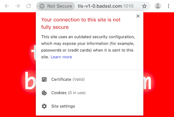 Π²Π΅ΡΡΠΈΠΉ TLS. ΠΠΎ ΡΠ°ΠΊΡΠΈΡΠ΅ΡΠΊΠΎΠ³ΠΎ ΠΏΡΠ΅ΠΊΡΠ°ΡΠ΅Π½ΠΈΡ ΠΏΠΎΠ΄Π΄Π΅ΡΠΆΠΊΠΈ Π½Π°ΡΠΈΠ½Π°Ρ Ρ Π²ΡΠΏΡΡΠΊΠ° Chrome 79, Π½Π°ΠΌΠ΅ΡΠ΅Π½Π½ΠΎΠ³ΠΎ Π½Π° 13 ΡΠ½Π²Π°ΡΡ, Π΄Π»Ρ ΡΠΎΠ΅Π΄ΠΈΠ½Π΅Π½ΠΈΠΉ Ρ ΠΈΡΠΏΠΎΠ»ΡΠ·ΠΎΠ²Π°Π½ΠΈΠ΅ΠΌ TLS 1.0 ΠΈ 1.1 Π½Π°ΡΠ½ΡΡ Π²ΡΠ²ΠΎΠ΄ΠΈΡΡΡΡ ΠΈΠ½Π΄ΠΈΠΊΠ°ΡΠΎΡ Π½Π΅Π±Π΅Π·ΠΎΠΏΠ°ΡΠ½ΠΎΠ³ΠΎ ΡΠΎΠ΅Π΄ΠΈΠ½Π΅Π½ΠΈΡ.