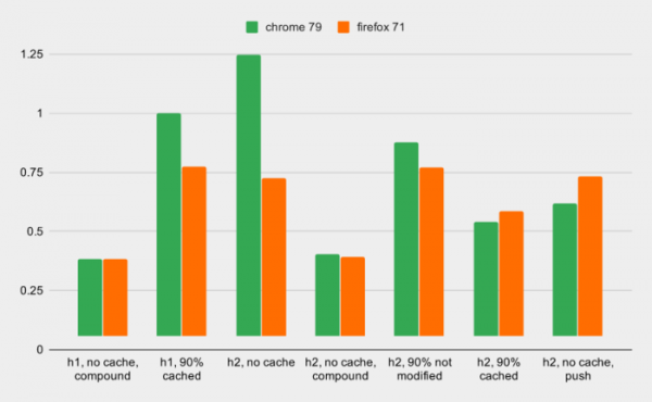 ΠΡΡΠ³ΠΈΠΌ Π²ΡΠ²ΠΎΠ΄ΠΎΠΌ ΡΠ²Π»ΡΠ΅ΡΡΡ ΡΠΎ, ΡΡΠΎ Π±ΡΠ°ΡΠ·Π΅ΡΠ½ΡΠΉ ΠΊΡΡ ΠΏΡΠΈ ΠΈΡΠΏΠΎΠ»ΡΠ·ΠΎΠ²Π°Π½ΠΈΠΈ HTTP/2 Π½Π΅ ΠΎΠΊΠ°Π·ΡΠ²Π°Π΅Ρ Π·Π½Π°ΡΠΈΡΠ΅Π»ΡΠ½ΠΎΠ³ΠΎ Π²Π»ΠΈΡΠ½ΠΈΡ Π½Π° ΠΏΡΠΎΠΈΠ·Π²ΠΎΠ΄ΠΈΡΠ΅Π»ΡΠ½ΠΎΡΡΡ ΠΎΠ±ΡΠ°Π±ΠΎΡΠΊΠΈ Π·Π°ΠΏΡΠΎΡΠΎΠ² (ΠΏΠΎΠ»Π½ΠΎΠ΅ Π²ΡΠΏΠΎΠ»Π½Π΅Π½ΠΈΠ΅ 501 Π·Π°ΠΏΡΠΎΡΠ° ΠΎΠΊΠ°Π·Π°Π»ΠΎΡΡ ΠΌΠ΅Π΄Π»Π΅Π½Π½Π΅Π΅ Π²ΡΠΏΠΎΠ»Π½Π΅Π½ΠΈΡ 51 Π·Π°ΠΏΡΠΎΡΠ° ΠΏΡΠΈ 90% Π½Π°ΠΏΠΎΠ»Π½Π΅Π½ΠΈΠΈ ΠΊΡΡΠ° Π²ΡΠ΅Π³ΠΎ Π² 1.2 ΡΠ°Π·Π° Π² Firefox ΠΈ 2.3 ΡΠ°Π·Π° Π² Chrome). ΠΡΠΏΠΎΠ»ΡΠ·ΠΎΠ²Π°Π½ΠΈΠ΅ Server Push Π½Π΅ ΠΏΠΎΠΊΠ°Π·Π°Π»ΠΎ ΡΡΡΠ΅ΡΡΠ²Π΅Π½Π½ΠΎΠΉ Π²ΡΠ³ΠΎΠ΄Ρ Π² Firefox, Π½ΠΎ ΠΎΠΊΠ°Π·Π°Π»ΠΎΡΡ ΡΡΡΠ΅ΠΊΡΠΈΠ²Π½ΡΠΌ ΠΏΡΠΈ Π·Π°Π³ΡΡΠ·ΠΊΠ΅ Π±ΠΎΠ»ΡΡΠΎΠ³ΠΎ ΡΠΈΡΠ»Π° ΡΠ΅ΡΡΡΡΠΎΠ² Π² Chrome. ΠΠ²ΡΠΎΡΡ ΠΈΡΡΠ»Π΅Π΄ΠΎΠ²Π°Π½ΠΈΡ ΡΠ°ΠΊΠΆΠ΅ ΠΎΡΠΌΠ΅ΡΠΈΠ»ΠΈ, ΡΡΠΎ ΠΎΠΏΡΠΈΠΌΠΈΠ·Π°ΡΠΈΡ ΡΠ΅ΡΠ²Π΅ΡΠ½ΠΎΠΉ ΡΠ°ΡΡΠΈ ΠΎΠΊΠ°Π·ΡΠ²Π°Π΅Ρ Π±ΠΎΠ»Π΅Π΅ ΡΡΡΠ΅ΡΡΠ²Π΅Π½Π½ΠΎΠ΅ Π²Π»ΠΈΡΠ½ΠΈΠ΅ Π½Π° ΠΏΡΠΎΠΈΠ·Π²ΠΎΠ΄ΠΈΡΠ΅Π»ΡΠ½ΠΎΡΡΡ, ΡΠ΅ΠΌ ΠΎΠΏΡΠΈΠΌΠΈΠ·Π°ΡΠΈΡ Π²ΡΠΏΠΎΠ»Π½ΡΠ΅ΠΌΠΎΠ³ΠΎ Π² Π±ΡΠ°ΡΠ·Π΅ΡΠ΅ ΠΊΠ»ΠΈΠ΅Π½ΡΡΠΊΠΎΠ³ΠΎ ΠΊΠΎΠ΄Π°.