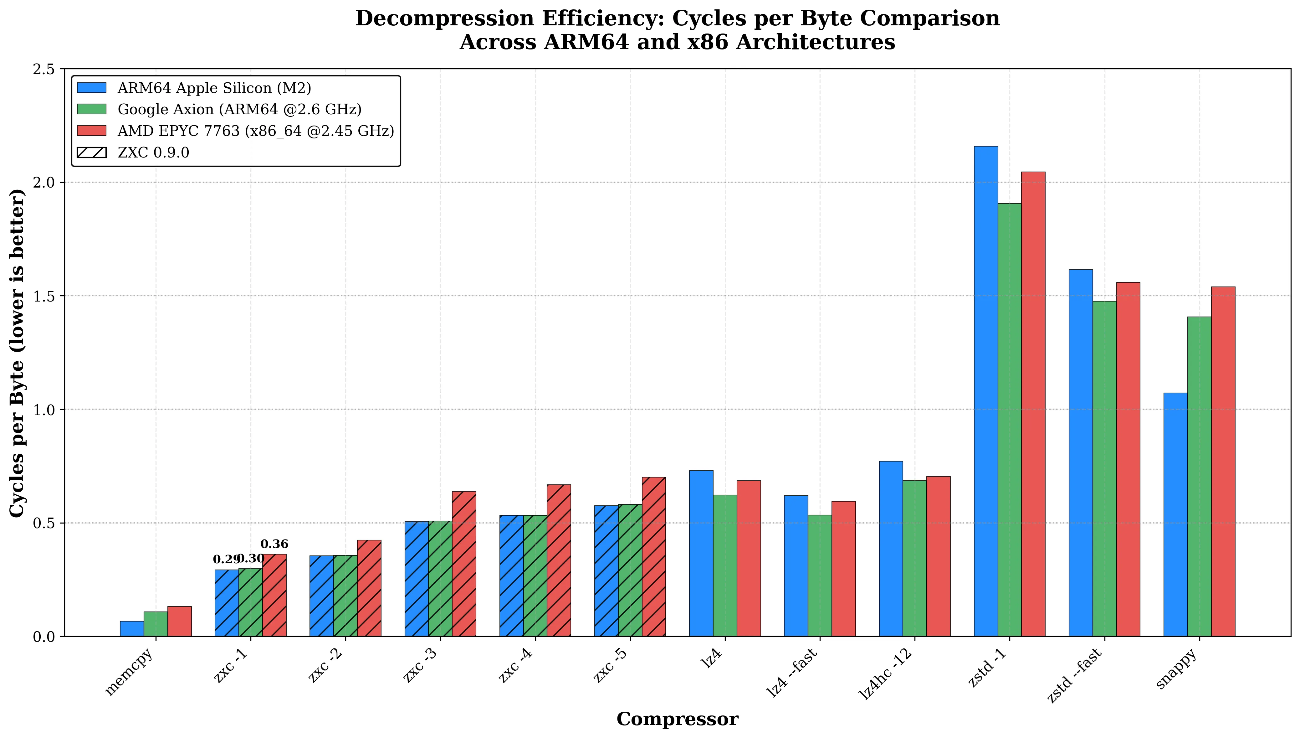 Π’ ΠΎΡ‚Π»ΠΈΡ‡ΠΈΠ΅ ΠΎΡ‚ Ρ‚Π°ΠΊΠΈΡ… ΠΊΠΎΠ΄Π΅ΠΊΠΎΠ², ΠΊΠ°ΠΊ LZ4, ZXC ΠΆΠ΅Ρ€Ρ‚Π²ΡƒΠ΅Ρ‚ ΡΠΊΠΎΡ€ΠΎΡΡ‚ΡŒΡŽ сТатия Ρ€Π°Π΄ΠΈ максимальной пропускной способности ΠΏΡ€ΠΈ распаковкС.